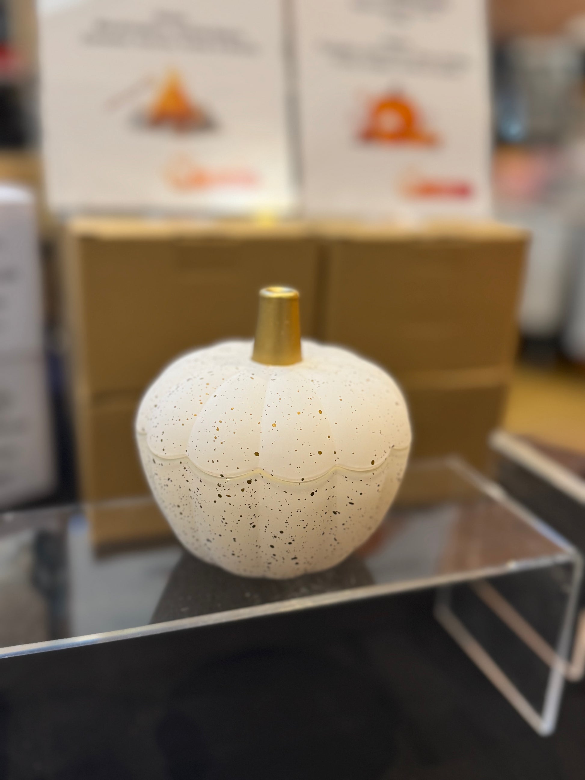 Indulge in the comforting sophistication of autumn evenings with our Toasted Marshmallow Candle, an elegant interpretation of a fireside favourite. Encased in a beautifully detailed, pumpkin shaped jar, this piece is finished in painted white with delicate gold speckles, capturing the subtle glow of candlelight dancing across crisp fall nights. The result is a statement of understated luxury, perfect for autumn collections, Halloween décor, or as a refined accent to any contemporary interior.
